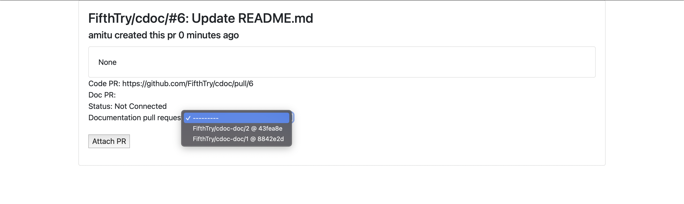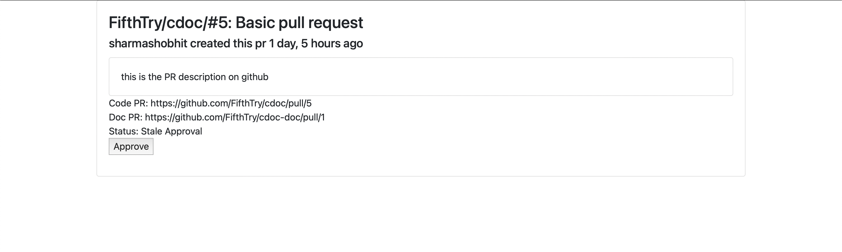 cdoc.<cdoc-base-url>/<repo-name>/pulls/<pr-number>/?query=<>cdoc-base-urlcdoc this would be gh.fifthtry.com (and gl.fifthtry.com in future when we support Gitlab and so on). For self-hosted cdoc it would be the domain where it is hosted.repo-name, pr-numberrepo-name, eg FifthTry/fpm and pr-number identy the pull request.query